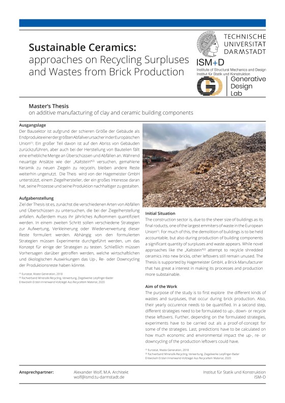 Der Bausektor ist aufgrund der schieren Größe der Gebäude als Endprodukte einer der größten Abfallverursacher in der Europäischen Union. Ein großer Teil davon ist auf den Abriss von Gebäuden zurückzuführen, aber auch bei der Herstellung von Bauteilen fällt eine erhebliche Menge an Überschüssen und Abfällen an. Während neuartige Ansätze wie der „Kaltstein“ versuchen, gemahlene Keramik zu neuen Ziegeln zu recyceln, bleiben andere Reste weiterhin ungenutzt. Die Theis wird von der Hagemeister GmbH unterstützt, einem Ziegelhersteller, der ein großes Interesse daran hat, seine Prozesse und seine Produktion nachhaltiger zu gestalten.
