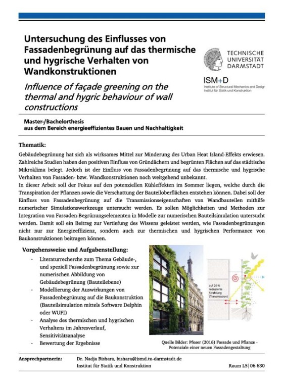 In dieser Arbeit soll der Fokus auf den potenziellen Kühleffekten im Sommer liegen, welche durch die Transpiration der Pflanzen sowie die Verschattung der Bauteiloberflächen entstehen können. Dabei soll der Einfluss von Fassadenbegrünung auf die Transmissionseigenschaften von Wandbauteilen mithilfe numerischer Simulationswerkzeuge untersucht werden. Es sollen Möglichkeiten und Methoden zur Integration von Fassaden-Begrünungselementen in Modelle zur numerischen Bauteilsimulation untersucht werden. Damit soll ein Beitrag zur Vertiefung des Wissens geleistet werden, wie Fassadenbegrünungen nicht nur zur Energieeffizienz, sondern auch zur thermischen und hygrischen Performance von Baukonstruktionen beitragen können.