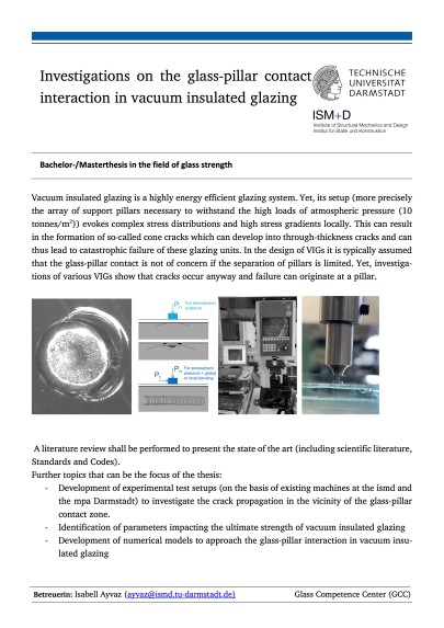 Vacuum insulating glazing (VIG) units are an innovative window technology that has the potential to revolutionize energy-efficient buildings. Windows and transparent façade elements are respon- sible for a large proportion of heat loss in buildings and therefore a large carbon footprint. A vac- uum insulation glazing consists of two or more glass panes between which a vacuum gap is created. This allows thermal effects to be minimized, thus optimizing the energy balance of the transparent areas of building envelopes. To ensure that the individual panes of the VIG can withstand the high stress of atmospheric pressure over several decades, small spacers are inserted into the vacuum gap as shown in the figure below. These are very small and, in addition to the edge seal which hermetically seals the VIG, have a decisive influence on the mechanical and thermomechanical behavior of VIGs. It is now exciting to investigate this influence and to develop implications for the normatively regulated use of the innovative glazing units in order to make a decisive contribution to the establishment of energy-optimized window and facade systems in Germany and Europe.