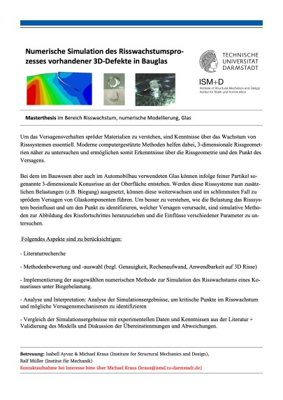 - Numerische Simulation des Risswachstumsprozesses vorhandener 3D-Defekte in Bauglas- Numerical simulation of the crack evolution of 3 dimensional defects in glass - 05.08.2024 - Das Versagen spröder Materialien wie Glas erfordert ein Verständnis des Risswachstums. Moderne Simulationen ermöglichen detaillierte Analysen von Rissgeometrien und Belastungseinflüssen. Dadurch können kritische Punkte identifiziert und das Risiko spröden Versagens minimiert werden. - Betreuer/innen: Isabell Ayvaz, M.Sc., Prof. Dr.-Ing. Michael Kraus